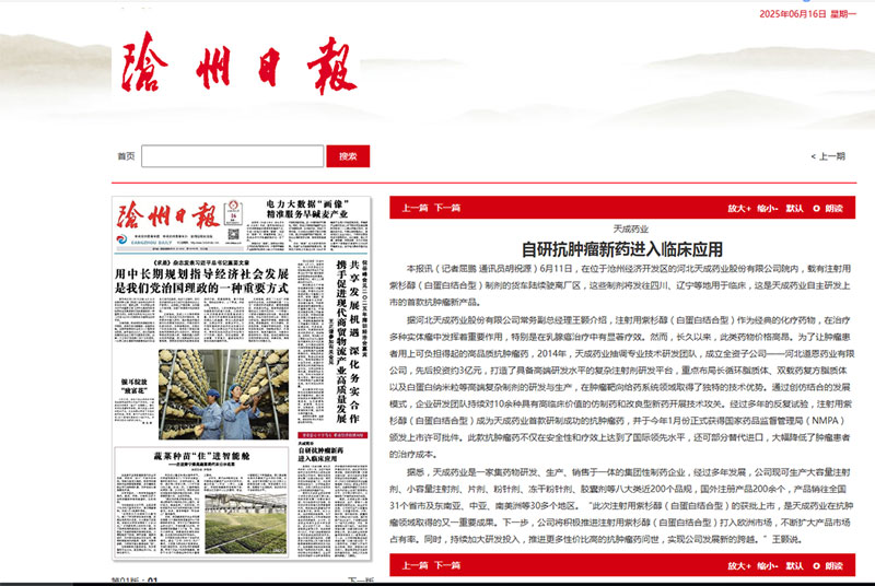 本报讯(记者屈鹏 通讯员胡祝源)6月11日,在位于沧州经济开发区的马博在线登录官网院内,载有注射用紫杉醇(白蛋白结合型)制剂的货车陆续驶离厂区,这些制剂将发往四川、辽宁等地用于临床,这是天成药业自主研发上市的首款抗肿瘤新产品。